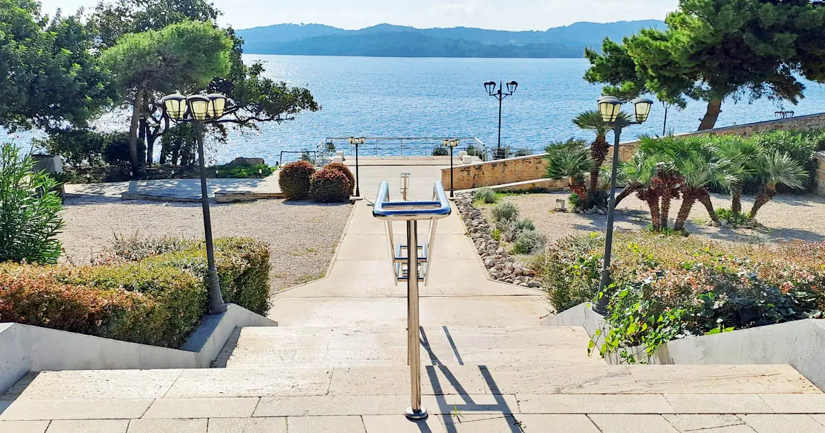Der schöne Kiesel-Strand direkt vor dem Hotel bietet einen herrlichen Ausblick auf türkis-farbenes glasklares Meerwasser und die Elaphiten. Hier gibt es auch einen kleinen Hafen, beziehungsweise eine hotel-eigene Schiffsanlegestelle, von wo aus Hotel-Gäste von Ausflugsschiffen abholt werden können. Über so eine Elaphiten Tour mit dem Schiff haben wir ebenfalls berichtet.